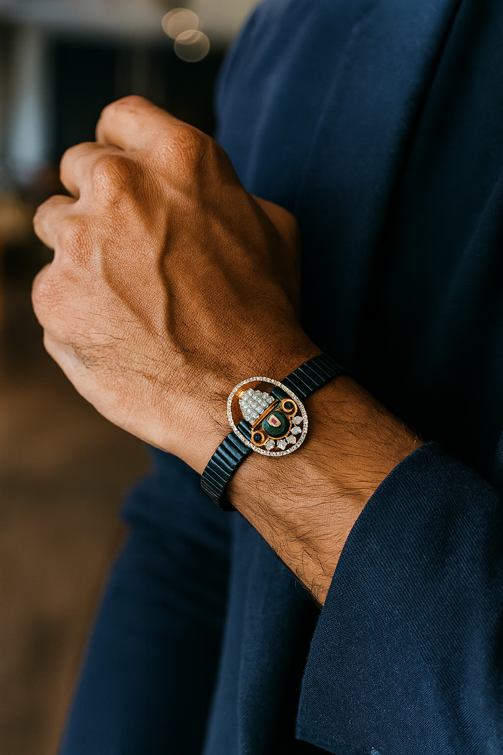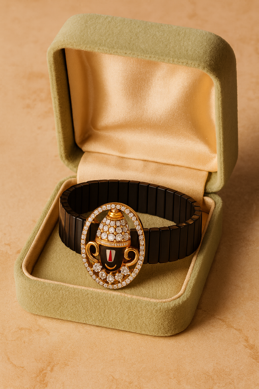 Inspired by Lord Balaji, this devotional gents bracelet showcases a detailed deity motif surrounded by a sparkling diamond-look halo. The rose gold accents contrast beautifully with the black band, giving it a refined and divine appearance. Perfect for daily wear, festive celebrations, and spiritual gifting.