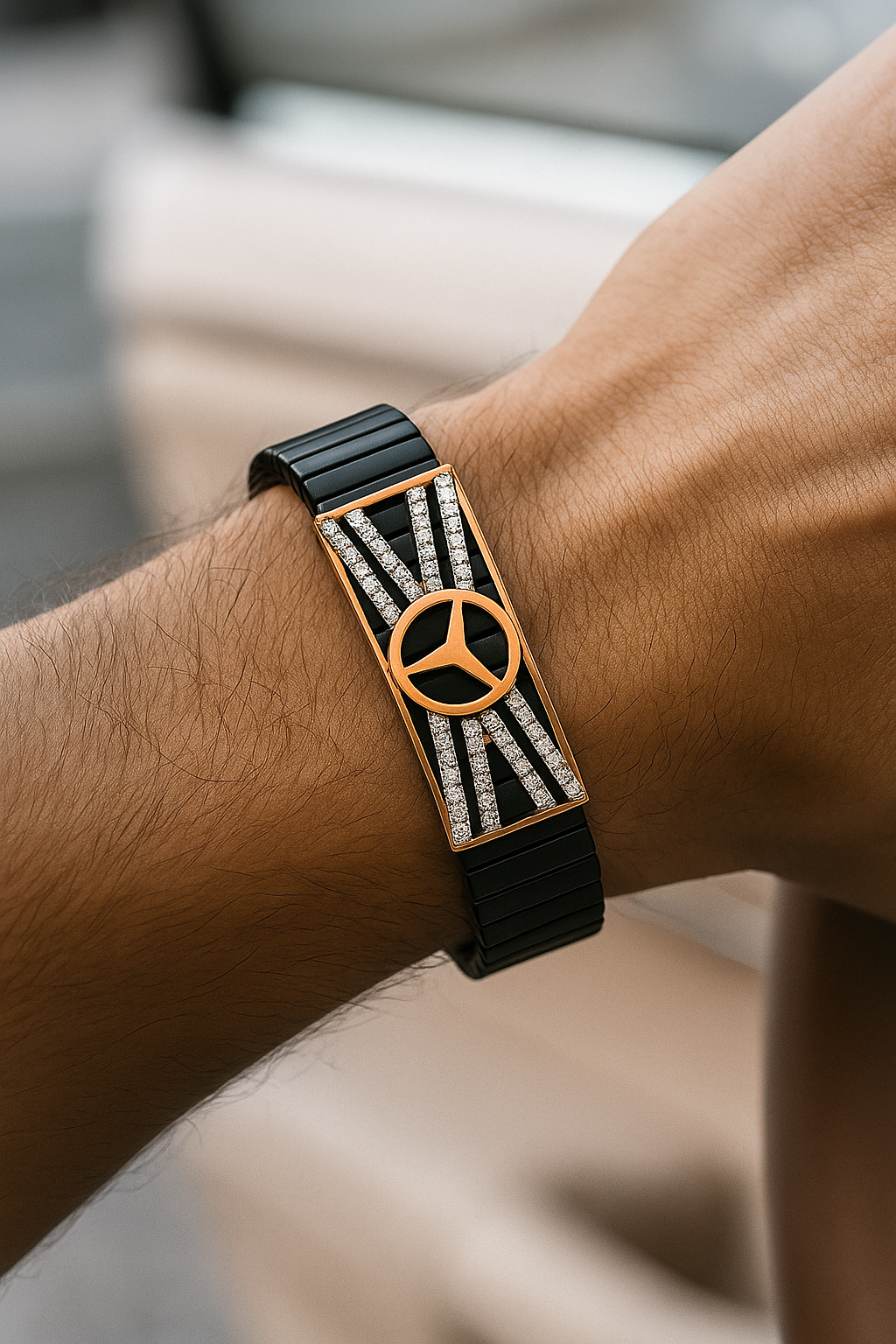 This premium men’s bracelet features a bold black stretch band paired with a stunning rose-gold centerpiece showcasing a modern circular tri-emblem. Radiating outward from the emblem are CZ-studded curved lines, creating a powerful, high-shine visual effect that stands out beautifully against the matte black band. The open-frame structure adds extra depth and luxury while keeping the design lightweight and contemporary. Crafted with a flexible stretch-fit band, it ensures smooth all-day comfort and durability. Perfect for parties, daily wear, gifting, and pairing with watches or stacked accessories. A bold luxury statement piece crafted for modern men with refined taste.