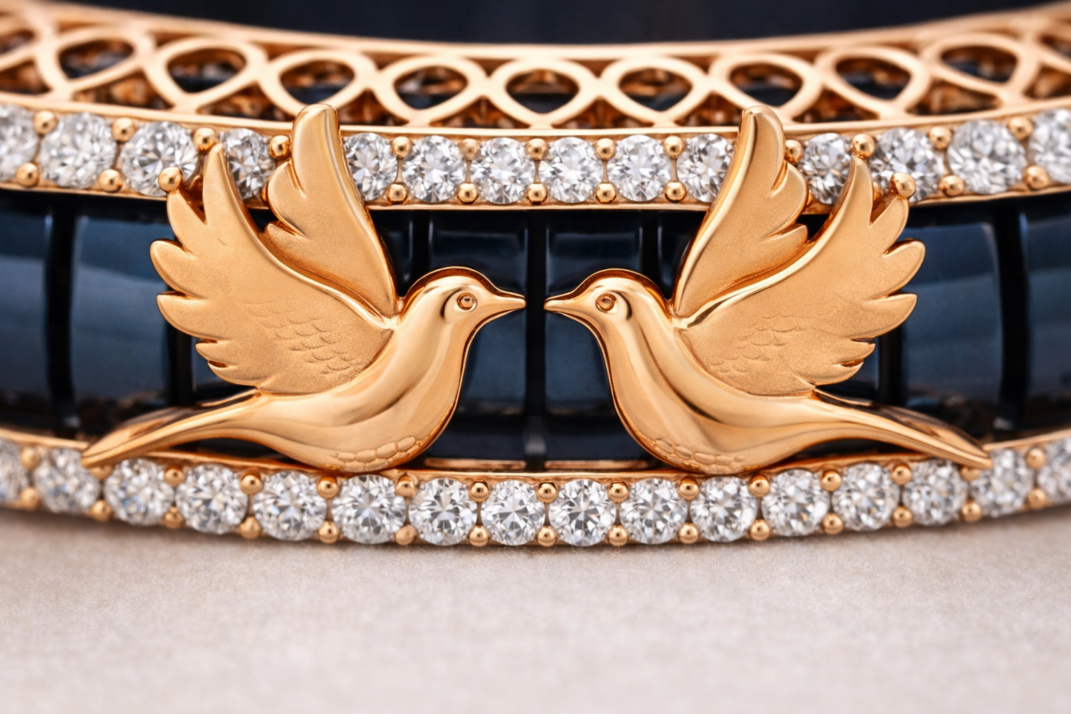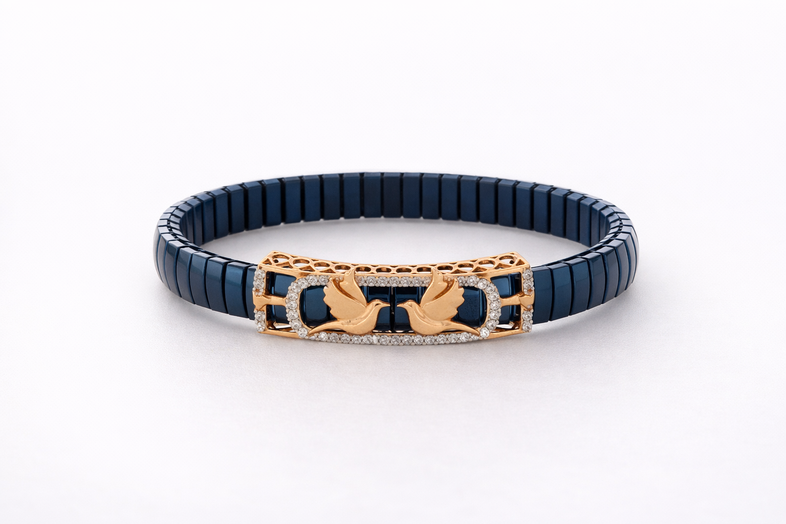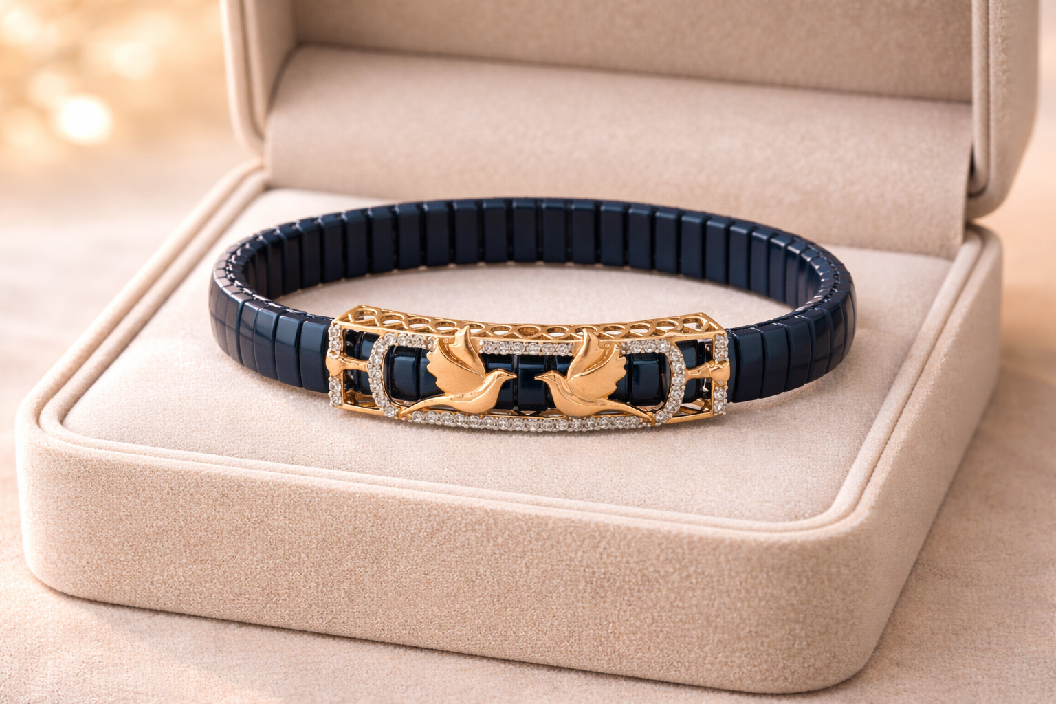 Celestial Wing Embrace Bracelet showcases exquisite craftsmanship with its striking deep blue enamel wings, symbolizing freedom and elegance. The rose gold setting provides a warm, luxurious foundation that complements the rich blue tones beautifully. Diamond pavé accents catch light with every movement, adding sophisticated sparkle without overwhelming the design. This bracelet merges artistic vision with fine jewelry expertise. The enamel work demonstrates meticulous attention to detail, while the precision-set diamonds elevate its refined aesthetic. The combination of materials creates a versatile piece suitable for both everyday wear and special occasions. The celestial-inspired motif resonates with those seeking meaningful jewelry that transcends trends. Whether worn alone or layered with complementary pieces, this bracelet makes a distinctive statement. The secure rose gold construction ensures durability, while the thoughtful design balances visual impact with wearable comfort. Perfect for collectors of contemporary fine jewelry or as a meaningful gift for someone who appreciates celestial symbolism and exceptional craftsmanship.