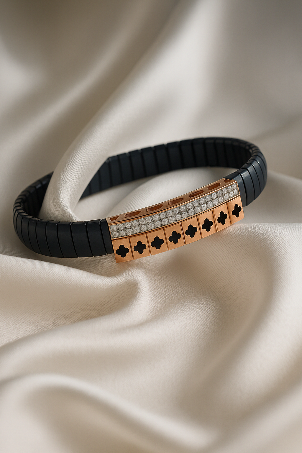 This cross-pattern gents bracelet features rose gold blocks with diamond-look accents, creating a bold and structured design. The blue segmented band provides strength and comfort for daily wear. Suitable for modern styling, festive occasions, and premium gifting, this bracelet adds a confident and stylish touch.