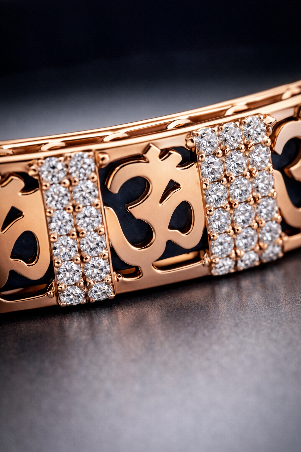 The Divine Om Aura Bracelet merges spiritual symbolism with contemporary luxury. Crafted in rose gold, this piece features an intricately detailed Om pendant adorned with diamond pavé work that catches light beautifully. The deep blue enamel inlay creates a striking contrast, evoking tranquility and cosmic energy while adding visual depth to the design. Each element serves a purpose: the sacred Om represents universal consciousness and inner peace, while the rose gold setting offers warmth and sophistication. The diamond pavé detailing elevates the bracelet from spiritual accessory to fine jewelry, making it suitable for both daily wear and special occasions. This bracelet appeals to those seeking meaningful adornment that honors spiritual practice without compromising on elegance. The combination of precious materials and symbolic design makes it an ideal gift for meditation enthusiasts, yoga practitioners, or anyone drawn to mindful living. Whether worn alone or layered with other pieces, it serves as a personal reminder of intention and connection.