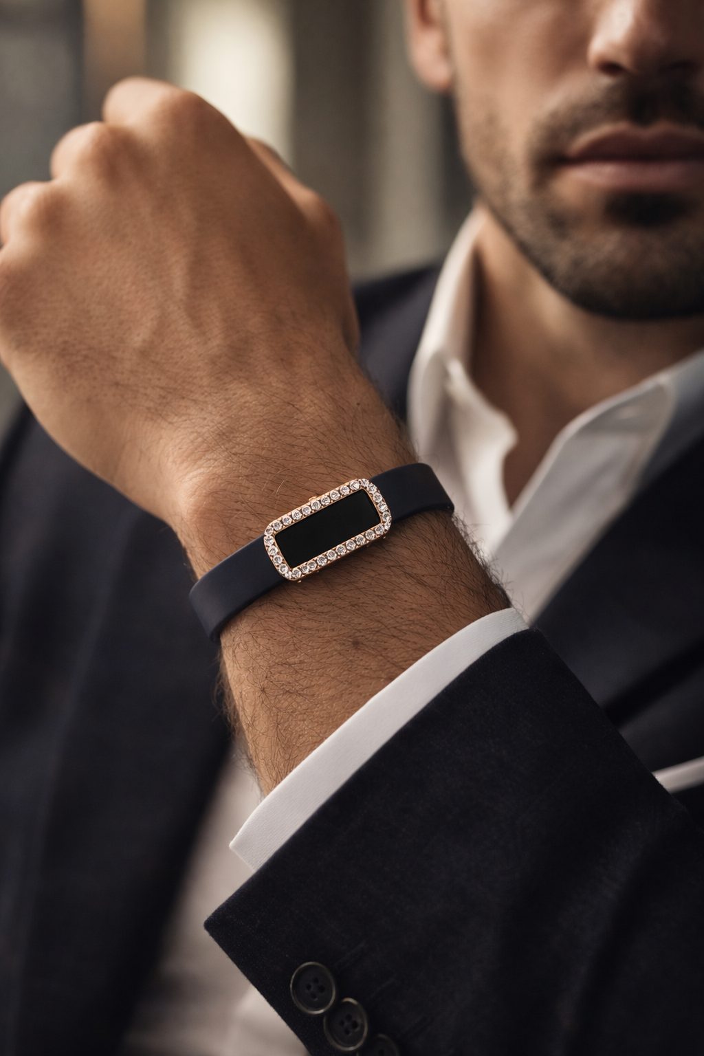Elegant Navy Silicone Bracelet with Rose Gold Pave Diamond Border