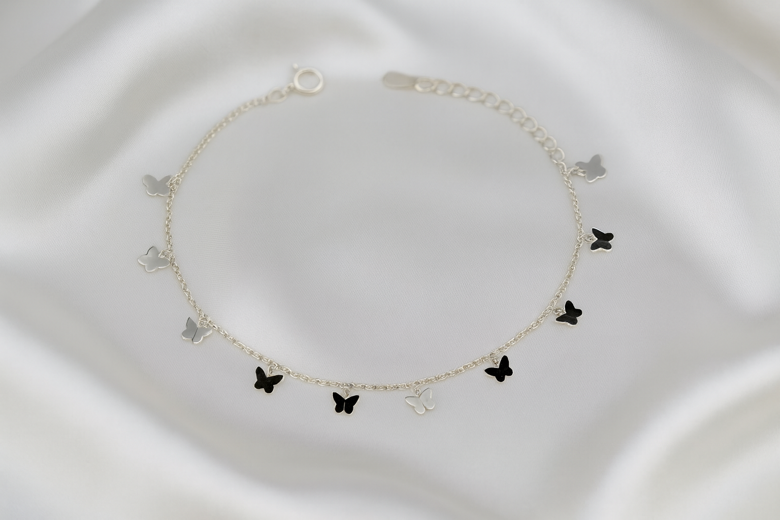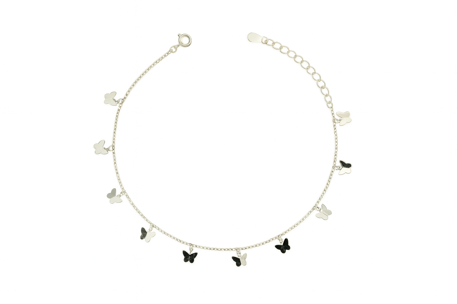 This elegant silver anklet features a mix of polished silver and glossy black butterfly charms that create a soft, feminine and stylish look. Designed for women and girls who love minimal jewellery with a cute twist, it sits lightly on the ankle and moves beautifully with every step. The adjustable chain ensures a perfect, comfortable fit for daily wear, office outfits or casual outings. Its dual-tone butterflies add charm and versatility, making it a perfect gift or personal accessory.