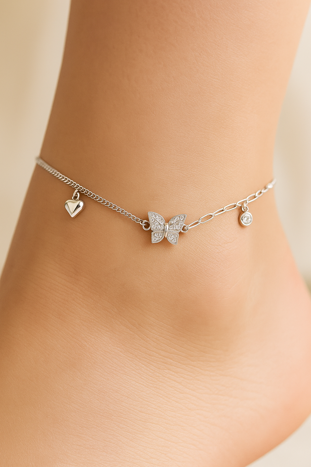 This elegant silver anklet features a sparkling butterfly charm at the center, paired with polished heart charms and shimmering CZ danglers for a refined, feminine look. The mixed-link chain design blends curb and paperclip elements, creating a stylish fusion suitable for both daily wear and special occasions. Lightweight, skin-friendly and fully adjustable, it offers a secure and comfortable fit for all ankle sizes.