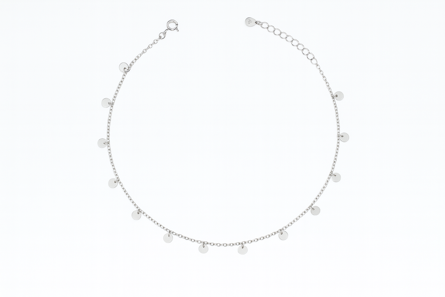 This elegant silver coin anklet adds a soft, playful shimmer with its evenly spaced mini-disc charms that move beautifully with every step. Designed for women and girls who love minimal yet stylish jewellery, it pairs effortlessly with ethnic, western or casual outfits. The lightweight chain ensures comfort for all-day wear, while the adjustable extension fits every ankle size perfectly. A durable clasp keeps it securely in place, making it ideal for daily use, travel, college, office or gifting.
