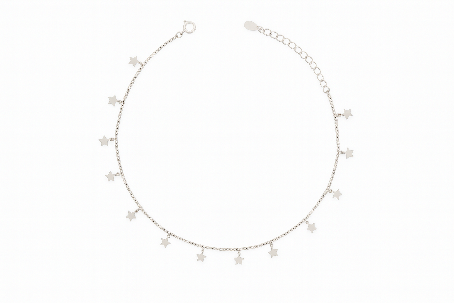 This silver anklet features cute mini star charms arranged evenly along a fine chain, giving it a soft celestial sparkle perfect for women and girls. The polished finish adds shine, while the lightweight feel makes it ideal for daily wear. Its adjustable extension ensures a comfortable fit for every ankle size. Pair it with dresses, ethnic outfits, or casual jeans for a charming, youthful look.