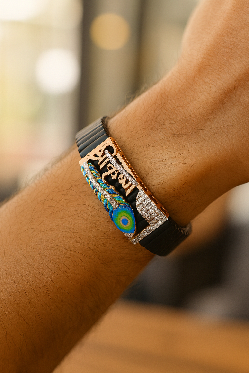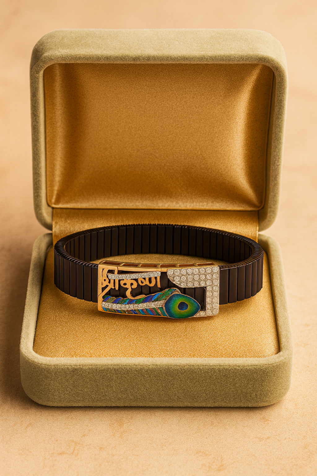 Inspired by Lord Krishna, this gents bracelet features a vibrant peacock feather motif symbolizing love, grace, and divinity. The rose gold panel with diamond-look detailing stands out against the black segmented band. A perfect blend of devotion and luxury for everyday wear and special occasions.
