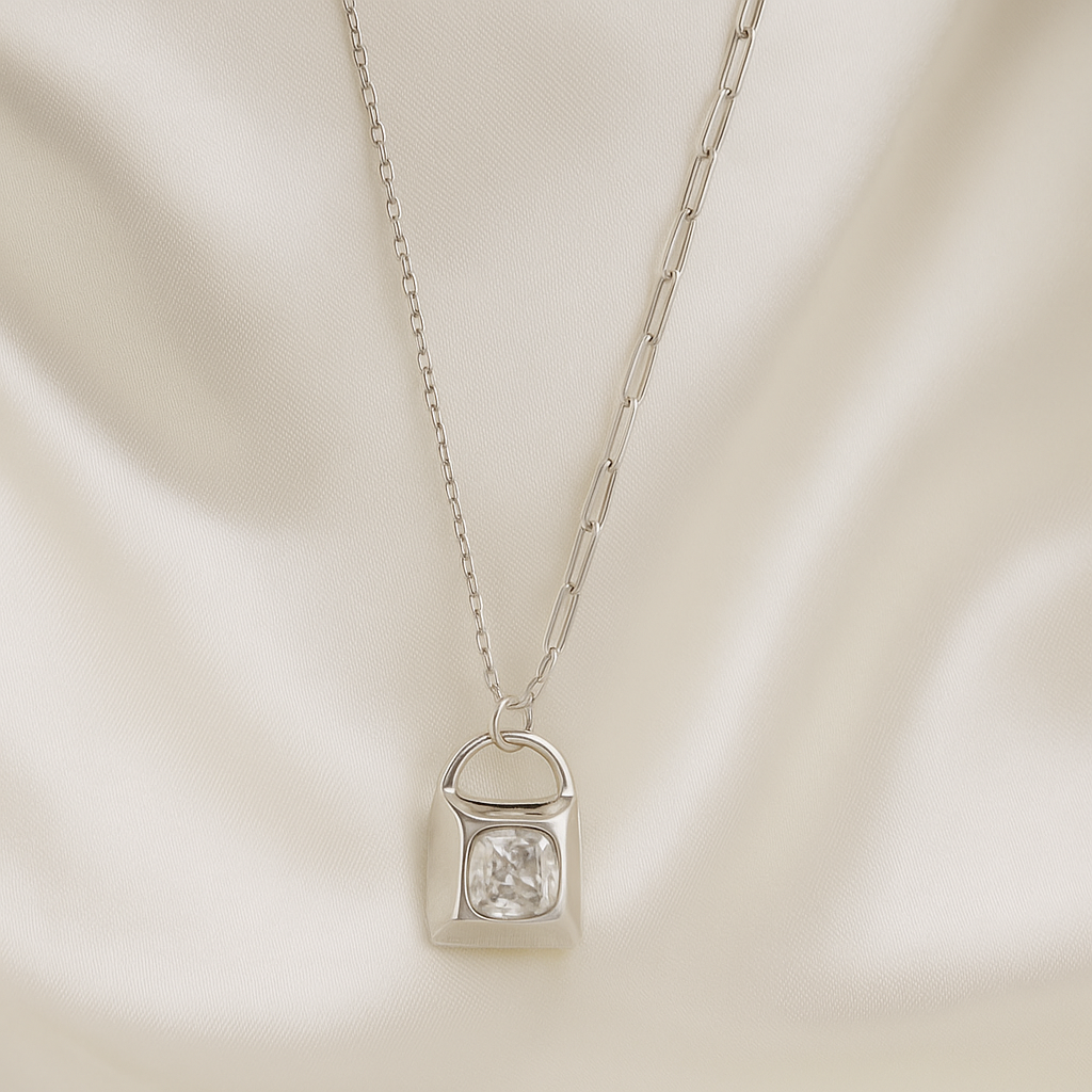 Minimal Lock Pendant Necklace with CZ Stone in White Gold Finish