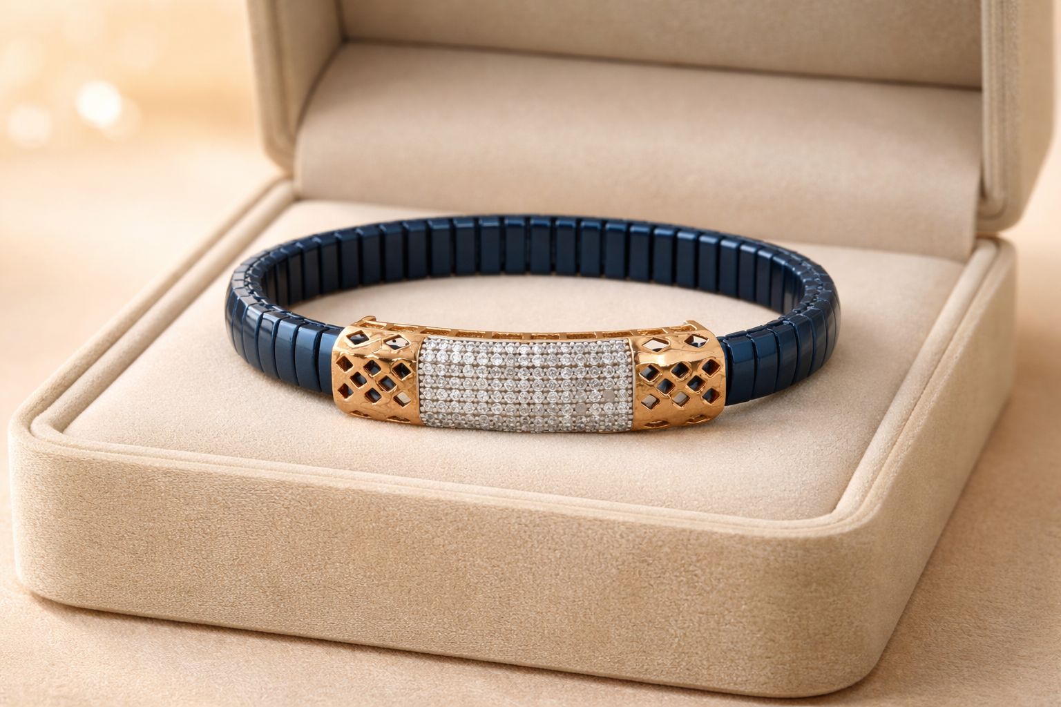 Elevate your jewelry collection with this sophisticated Lumière Lattice Pavé Bracelet, a masterpiece combining contemporary design with timeless elegance. Crafted in rose gold, the intricate lattice framework creates a striking geometric pattern that catches light beautifully from every angle. The deep blue enamel inlay adds a luxurious pop of color, offering versatility for both casual and formal occasions. The pavé setting showcases meticulously placed stones that enhance the bracelet's brilliance and depth. This piece demonstrates exceptional craftsmanship, with each detail carefully executed to ensure durability and lasting beauty. The rose gold finish provides a warm, flattering tone that complements various skin tones and coordinates seamlessly with other jewelry pieces. Perfect for those who appreciate refined aesthetics and quality construction, this bracelet serves as a statement accessory or an elegant everyday wear. Whether you're dressing up for special events or adding sophistication to your regular wardrobe, the Lumière Lattice Pavé Bracelet delivers understated luxury with distinctive character.