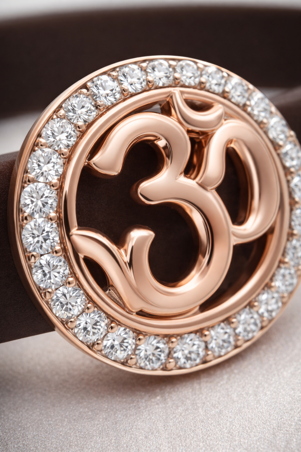 Luxury Brown Silicone Bracelet with Rose Gold Om Symbol & Diamond Halo