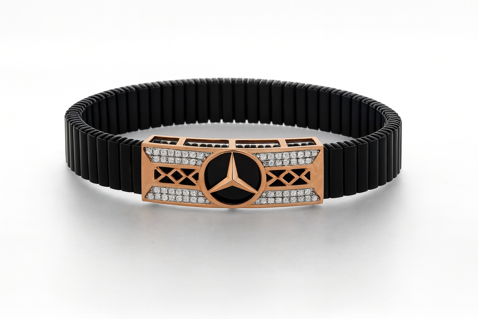 This luxury men’s bracelet features a bold black ceramic stretch band paired with a striking rose-gold centerpiece showcasing a premium Mercedes-inspired emblem. The centerpiece is embellished with shimmering CZ stones for a refined designer look. The flexible stretch band provides a secure and comfortable fit for everyday wear, while the masculine statement plate adds a powerful style element. Crafted from durable and skin-friendly materials, this bracelet is perfect for festive outfits, parties, gifting, and modern daily styling. A must-have accessory for men who love luxury detailing and performance-inspired fashion.