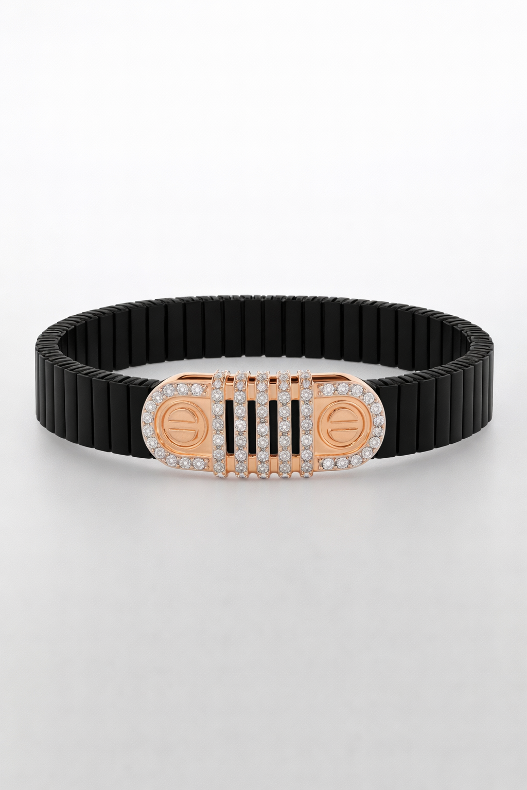The Nocturne Elite Bracelet represents sophisticated craftsmanship with its striking black enamel finish and distinguished diamond crest. This refined piece seamlessly transitions from day to evening wear, offering versatile elegance for the discerning wearer. The black enamel provides a bold, contemporary aesthetic while the diamond crest adds a touch of timeless luxury. The contrast between the deep enamel and sparkling diamonds creates visual depth and dimension, making this bracelet a statement accessory that complements both minimalist and ornate styling. Expertly constructed with attention to detail, this bracelet delivers the perfect balance of modern design and classic opulence. Whether worn alone for understated sophistication or layered with complementary pieces, it serves as a versatile addition to any jewelry collection. Ideal for those who appreciate quality materials and thoughtful design, the Nocturne Elite Bracelet elevates your personal style with understated glamour and enduring appeal.