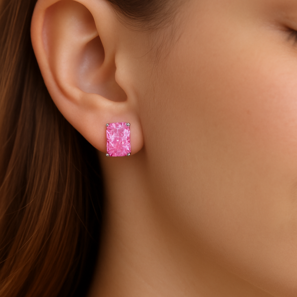 These elegant pink cushion-cut stud earrings add a stunning pop of color to any look. Designed with vibrant, finely faceted stones, they deliver exceptional brilliance and a luxurious feel. The classic four-prong setting ensures secure wear while allowing maximum light reflection for a radiant shine. Perfect for daily styling, parties, gifting, or adding a feminine touch to evening outfits, these statement studs blend charm and sophistication effortlessly. Lightweight and comfortable, they offer all-day wearability with a premium finish. A beautiful accessory for women who love standout yet timeless jewelry.