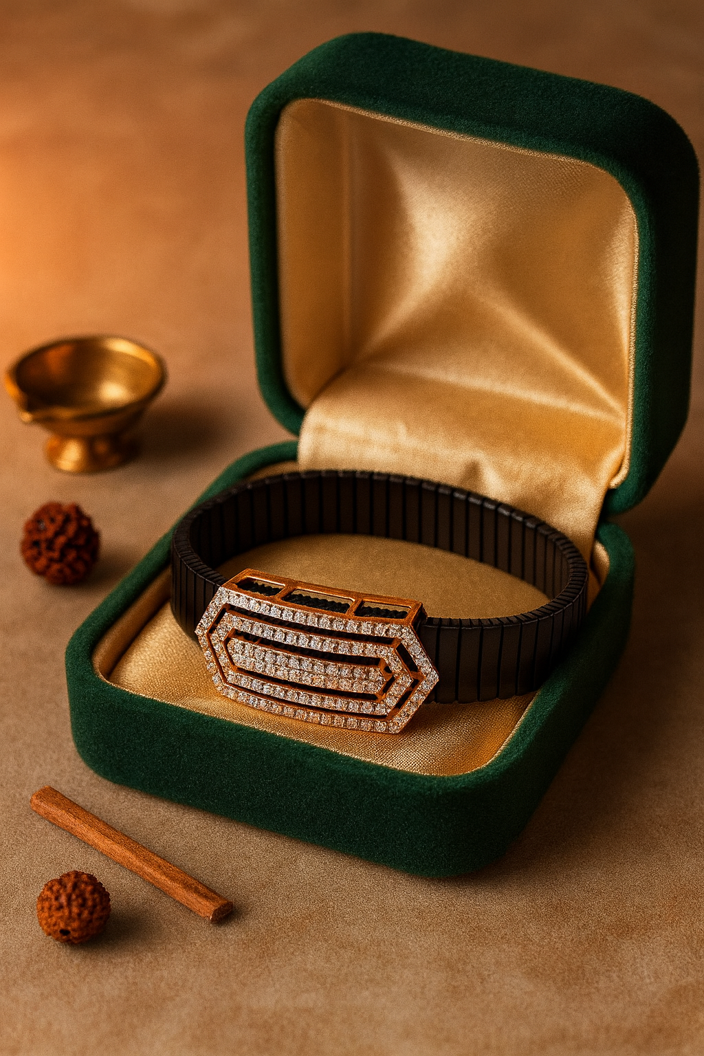 This designer men’s bracelet features a bold matte black ceramic stretch band paired with a stunning layered geometric centerpiece in rose gold. The multi-frame plate is fully embellished with shimmering CZ stones, creating a striking luxury effect that elevates any outfit. Its flexible, skin-friendly stretch design ensures perfect comfort and secure wear throughout the day. The sharp geometric detailing adds a powerful masculine appeal, making it ideal for festive looks, parties, gifting and modern everyday fashion. A premium statement accessory crafted for men who appreciate elegant, standout style.