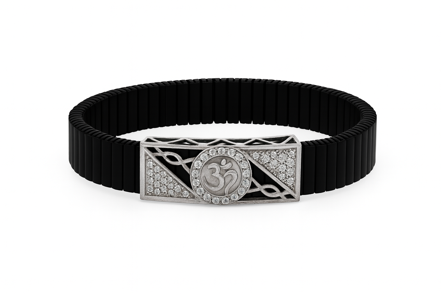 This stylish men’s bracelet features a bold matte black ceramic stretch band paired with a modern rose-gold geometric centerpiece. The plate showcases layered CZ stone accents arranged in a striking V-shape pattern, combined with cutout triangle detailing for an edgy designer look. The flexible stretch band ensures a secure and comfortable fit for everyday wear, while its durable and skin-friendly construction makes it ideal for long-lasting use. Perfect for modern fashion, festive outfits and premium gifting, this bracelet adds a strong contemporary statement to any wardrobe.