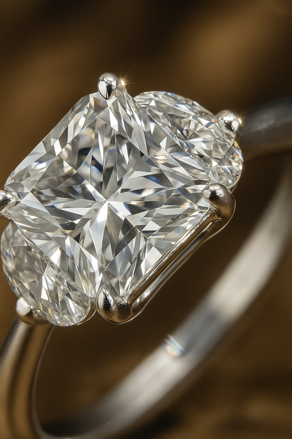 • Radiant cushion-cut solitaire with side oval stones