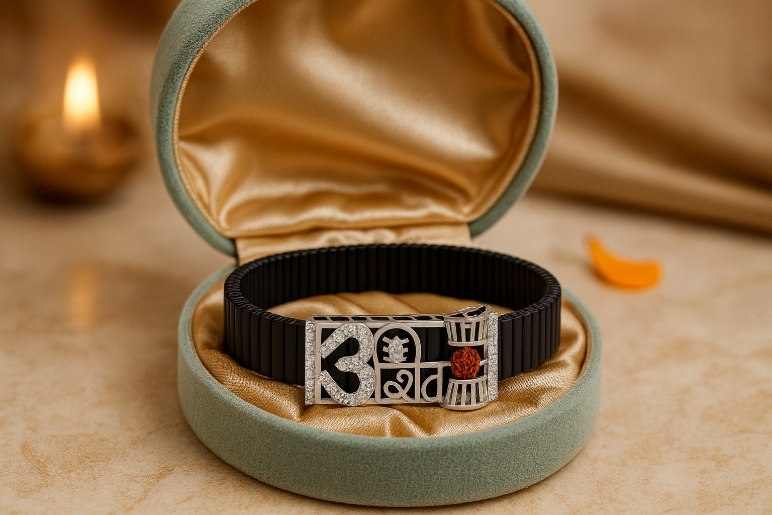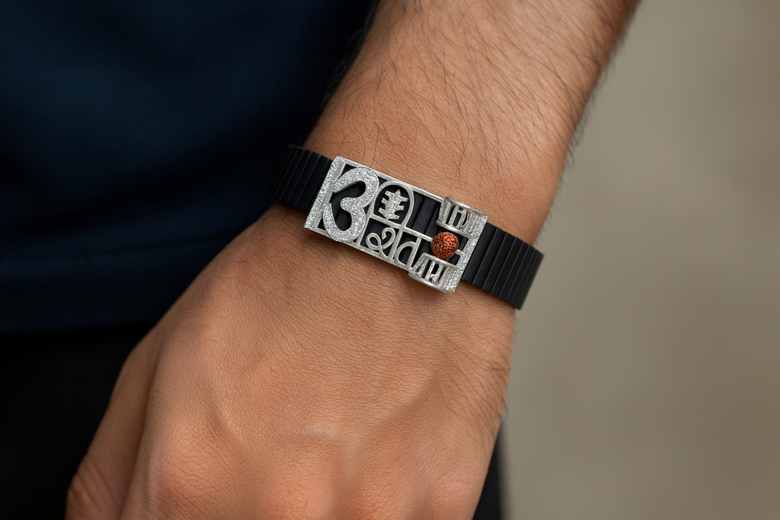 This premium men’s bracelet features a powerful Shiva-inspired design combining Trishul, Damru and natural Rudraksha, symbolising strength, protection and spiritual energy. The rose-gold centerpiece is artistically crafted with intricate cutwork and shimmering CZ stones that enhance the divine appeal. The natural Rudraksha bead adds authenticity and sacred significance, while the matte black ceramic stretch band ensures a comfortable and durable fit. Ideal for daily spiritual wear, festive looks or gifting, this bracelet blends devotion with modern masculine style—perfect for men who value meaningful, designer accessories.