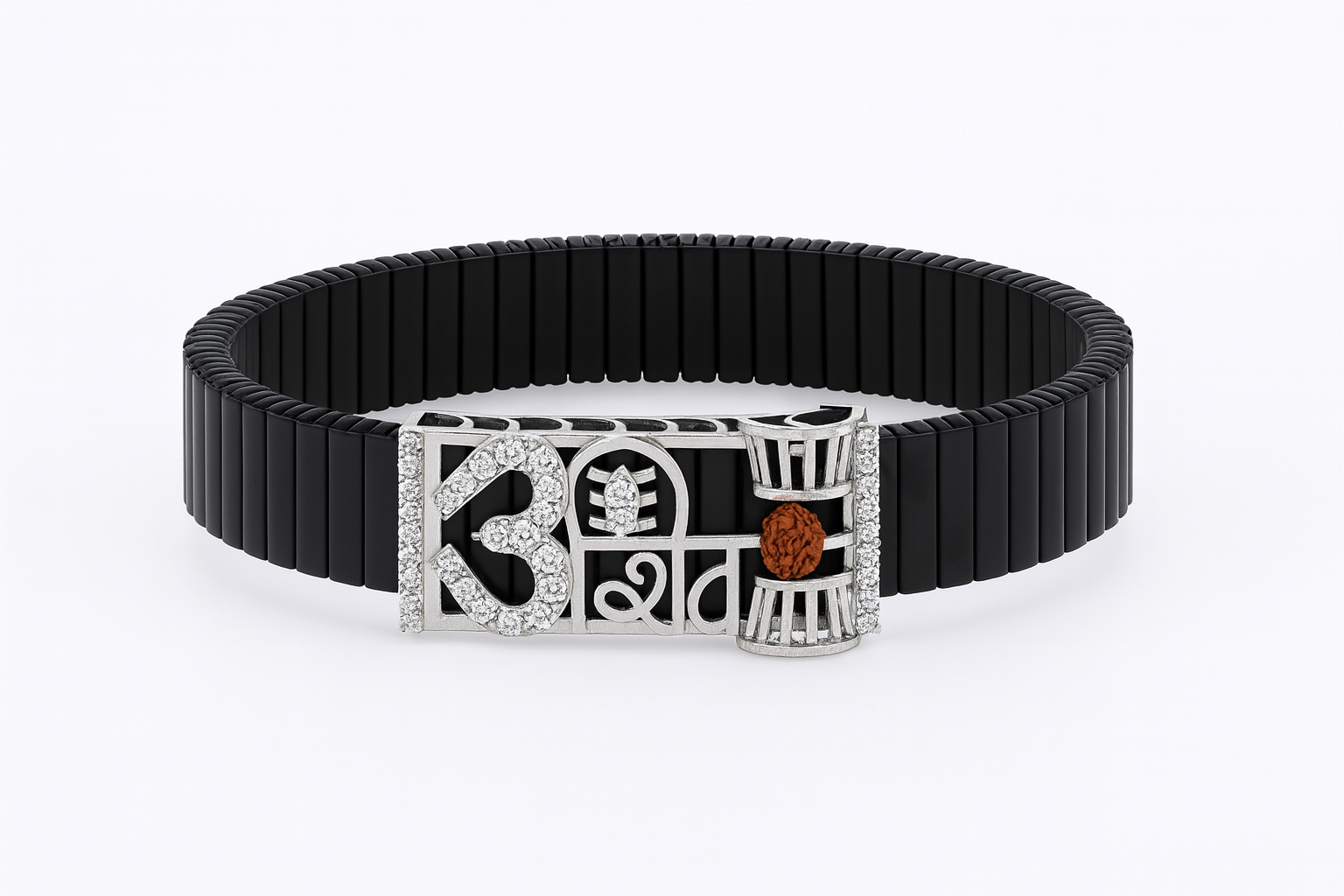 Shiva Trishul Damru Rudraksha Men’s Bracelet Rose-Gold Ceramic Stretch Band with CZ Devotional Detailing